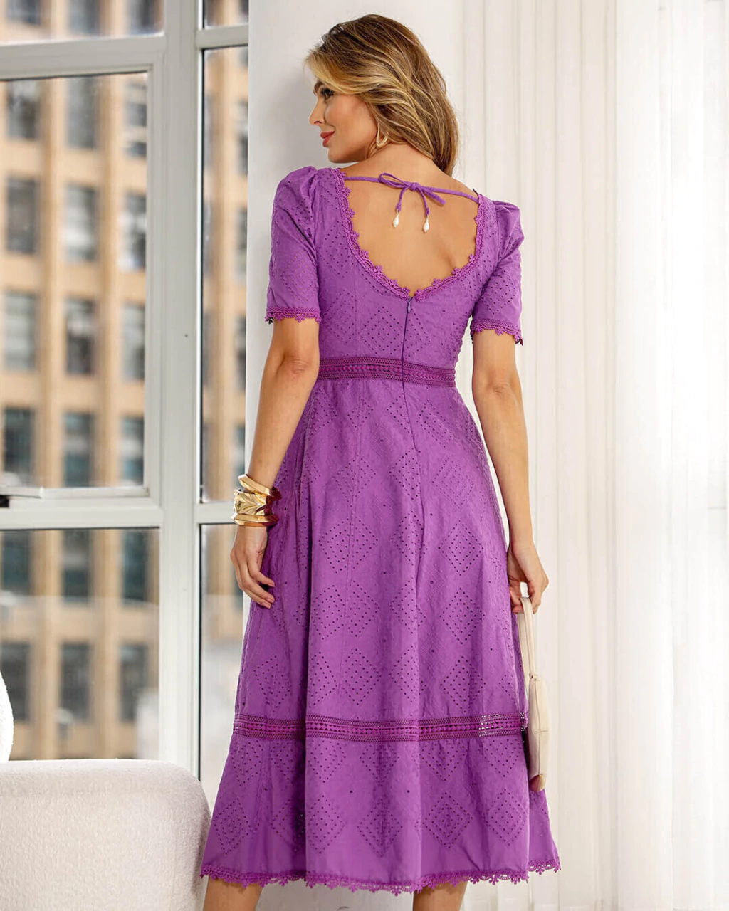 Vestido Midi produzido em Laise de Algodão Bordada Roxo. Modelagem Lady Like; decote princesa com contorno em renda e pregas; manga levemente princesa com renda na boca da manga; saia godê com com recortes de nesgas; Renda larga na cintura e barrado; atrás possui um lindo decote com amareação e detalhe de pingente e fechamento por zíper invisivel centro-costas; possui forro completo. Vestido delicado e romântico para festas e ocasiões especiais, além de ter ótima qualidade e fino acabamento. Perfeito para Festas, Formatura, Casamento, Aniversários, Chás, etc.