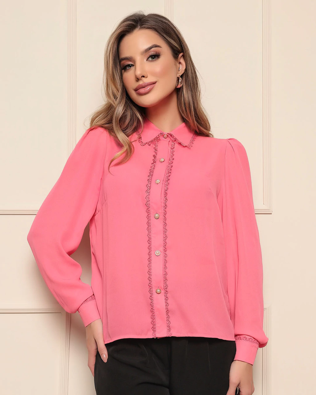 Blusa Social Feminina produzida em Crepe + Regata Interna Cor Rosa; manga Longa com Punho e detalhes em renda e botões dorado-perolados; Gola com renda; acabamentos de Vista, punho e gola entretelados; acompanha regata interna para forrar. Blusa super delicada e super versátil