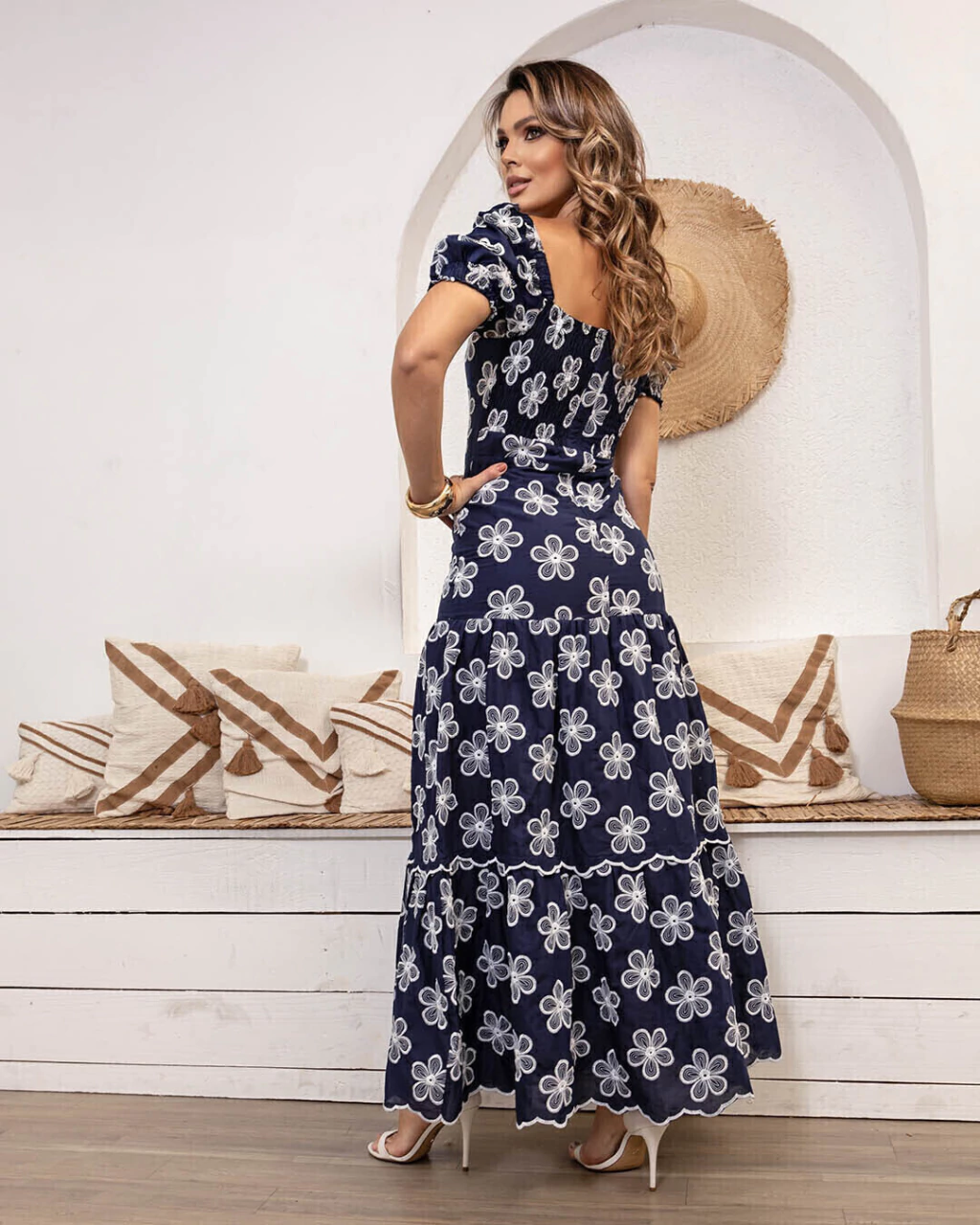 Vestido Laura Longo de Laise de Algodão Azul Marinho. Possui modelagem justa na parte de cima; camadas com acabamento bordado da laise; fenda lateral na frente; manga curta bufante com elástico no ombro e lastex no punho; atrás possui lastex nas costas e fechamento por zíper invisível; todo forrado. Vestido confortável e com um caimento leve, além de super versátil, pois combinado com diferentes acessórios pode ser usado em diversas ocasiões durante o dia ou noite.