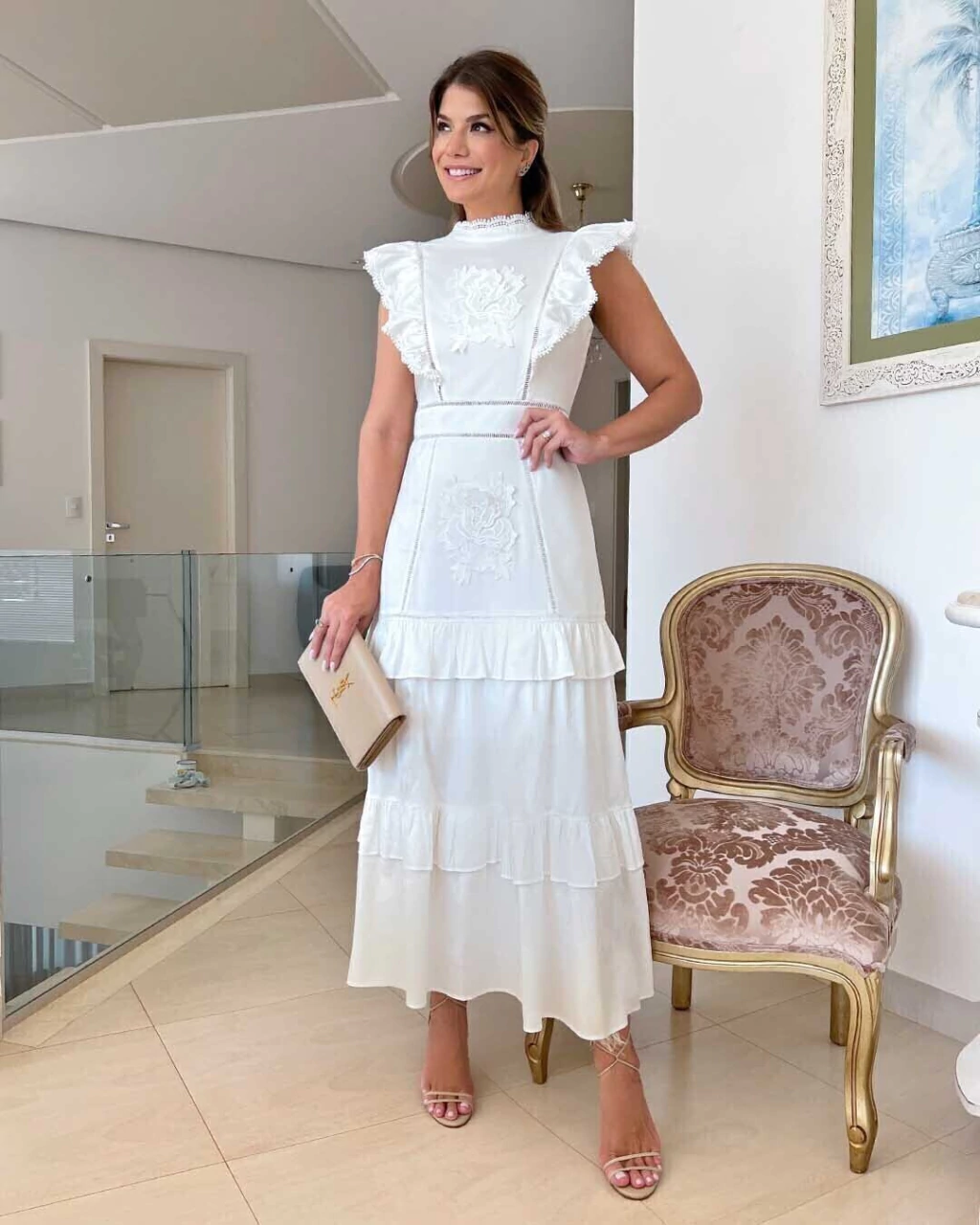 Vestido Maxi Midi produzido em Tricoline Cor Off White. Possui modelagem Evasê com marias, babados e Detalhes em Guipir; Gola alta com acabamento em bico de guipir; charmosos babados laterais com guipir que formam as mangas; e aplicações de flor em guipir. Vestido muito confortável de um caimento e modelagem impecáveis, pois o tecido é leve e estruturado, além de romântico e Delicado. Possui forro, não ficando transparente. Ótima qualidade e fino acabamento! Modelo de Vestido Branco para cha revelação, ideal também para Casamento no Civil, Casamento no Cartório, Batizado para Mãe, Formatura, Missa, Reovação de Votos, e diversas ocasiões que pedem um vestido simples, mas elegante.